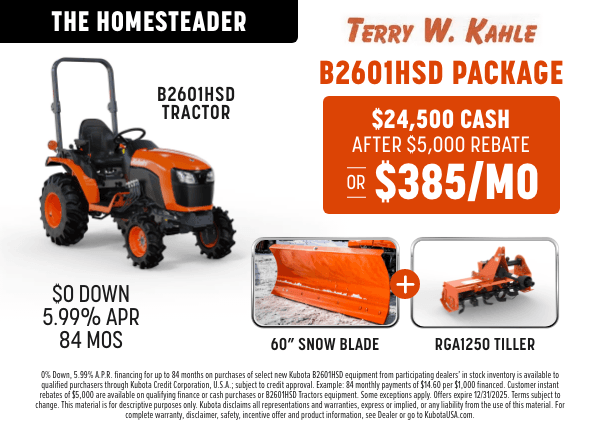 If you're looking for quality equipment and exceptional services provided by trained experts, you've come to the right place. At Terry W. Kahle, we pride ourselves on matching each customer's unique needs with the equipment that will serve them best. We're glad you're here, where you can check out our inventory, order parts, schedule a service appointment or simply give us a call at 814-797-1188 or toll free at 1-866-TWKAHLE (1-866-895-2453) and let us know how we can help you.